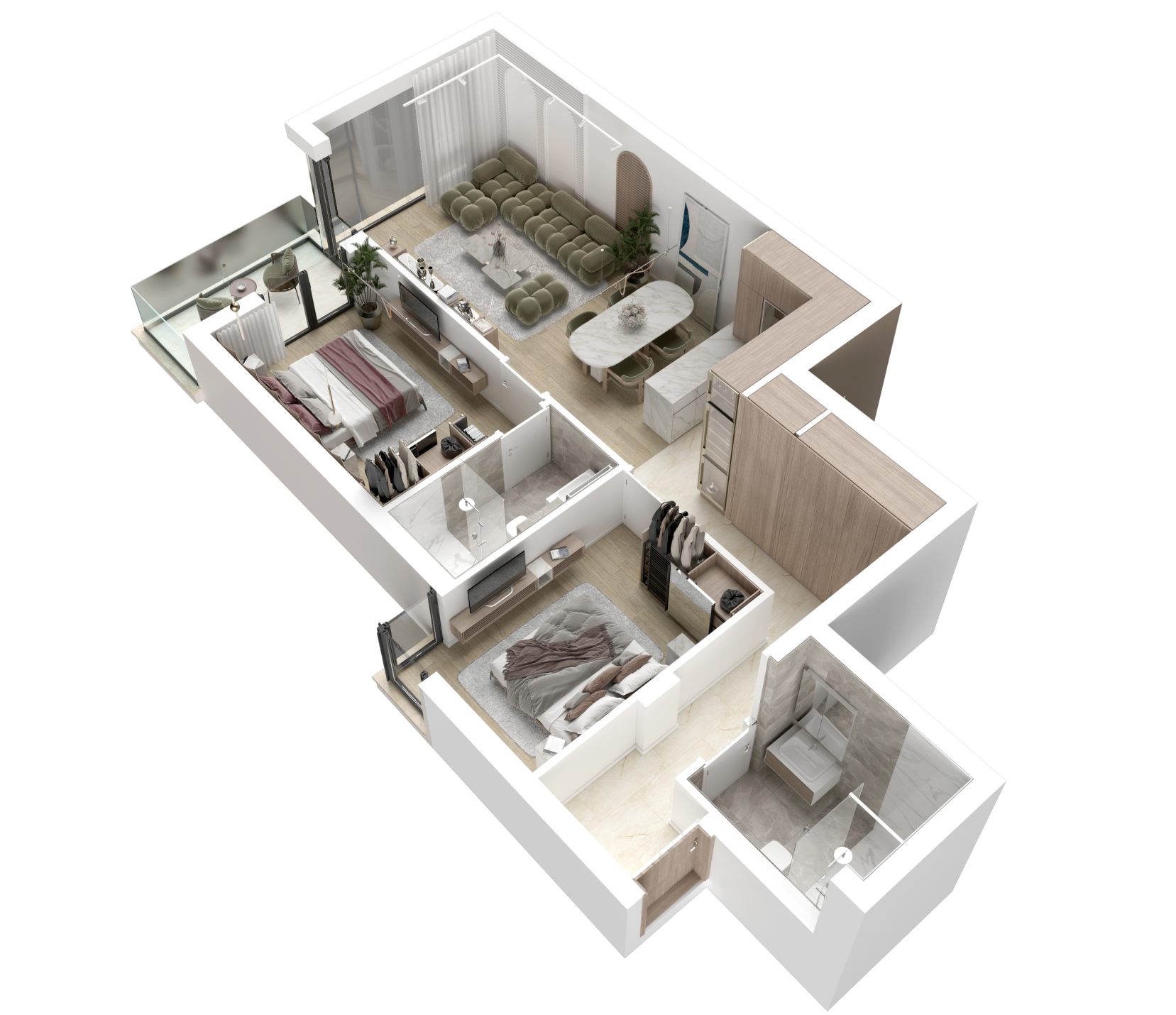 Projektovani tako da kvadratura na pravi način prati strukturu, a maksimalna iskorišćenost prostora omogućava da se u svakom delu stana oseti sklad između racionalnog i funkcionalnog.